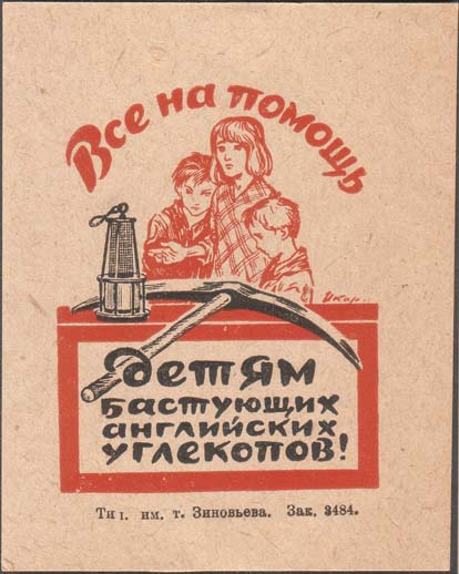 1926 г. Разм. 68 х 86 мм. Двухцветная печать на толстой светло-бежевой бумаге. В центре трое детей, кирка и лампа. Сверху полукругом текст: «Все на помощь». Внизу в прямоугольной рамке продолжение текста в четыре строки: «Детям бастующих английских углекопов». Внизу мелким шрифтом выходные данные: «Тип. им. т. Зиновьева. Зак. 3484».