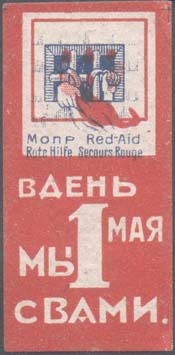 1929 г. 01.05.1929 г. Разм. 28 х 58 мм. Двухцветная печать на желтоватой бумаге с мелованным верхним слоем. Сверху в прямоугольной рамке разм. 22,5 х 22,5 мм эмблема МОПР. Внизу под эмблемой аббревиатура: «МОПР» на русском, английском, немецком и французском языках. Внизу текст четыре строки: «В день 1 мая мы с вами».