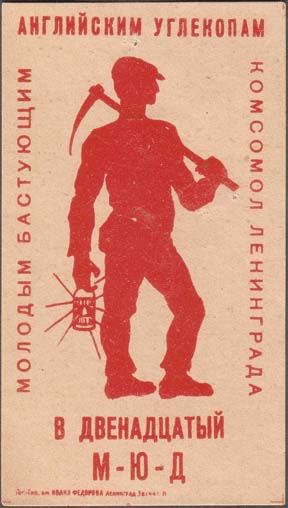 1926 г. Разм. 48 х 85 мм. Одноцветная печать на желто-серой бумаге. В центре силуэт шахтера с киркой и лампой. По периметру текст: «Молодым бастующим английским углекопам комсомол Ленинграда. В двенадцатый М-Ю-Д». Слева внизу мелким шрифтом выходные данные: «Гос. тип. им. Ивана Федорова Ленинград Звениг. 11».