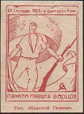 1923 г. Разм. 45 х 61 мм. Одноцветная печать на кремовой бумаге. В центре в прямоугольной рамке разм. 39 х 51 мм рабочий с развевающимся знаменем в одной руке и винтовкой в другой. Сверху текст: «23 сентября 1923 г. в Болгарии». Внизу текст: «Памяти павших борцов». Внизу мелким шрифтом выходные данные: «Тип. «Красной Газеты»».