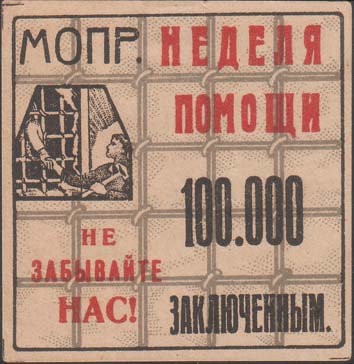 1924 г. 01.12.1924 г. Разм. рамки 56 х 56 мм. Трехцветная печать на кремовой бумаге. В прямоугольной рамке с закругленными краями на фоне в виде тюремной решетки слева эмблема МОПР. Слева сверху аббревиатура «МОПР». Слева внизу текст в три строки: «Не забывайте нас!». Справа текст в четыре строки: «Неделя помощи 100.000 заключенным». По углам знака разграничительные линии.