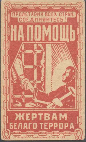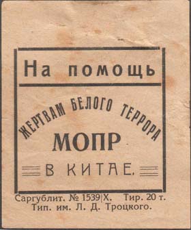 1931 г. 18.03.1931 г. Разм. 50 х 82 мм. Одноцветная печать на желтоватой бумаге. В прямоугольной рамке в виде цепи в центре эмблема МОПР. Сверху текст в две строки: «Пролетарии всех стран, соединяйтесь». Ниже текст: «На помощь». Внизу продолжение текста в две строки: «Жертвам белого террора». Внизу под рамкой выходные данные мелким шрифтом: «1-ая Гос. Лит. К.П.Т. Симферополь, Лит. 517 зак. 29».