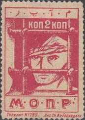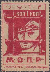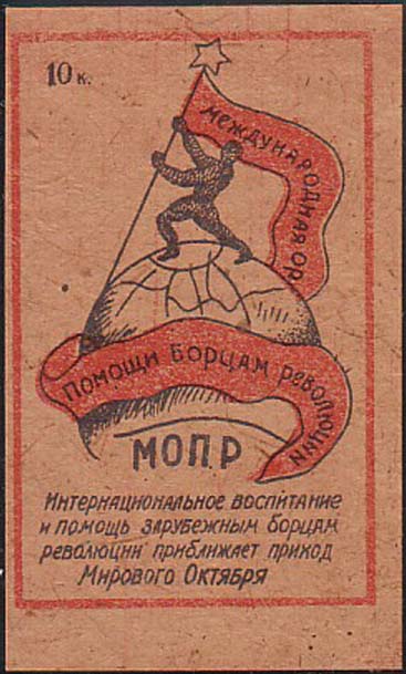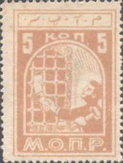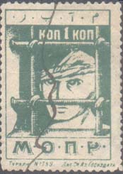 1930(?) г. Разм. 53 х 63 мм. Одноцветная печать на плотной желтоватой бумаге низкого качества. В центре двойной прямоугольной рамке 46 х 55 мм дополнительная круглая рамка диаметром 33 мм. В круглой рамке пионер с горном на фоне демонстрации. По периметру между рамками текст: «Помогите детям Политзаключенных Зарубежных стран. МОПР».