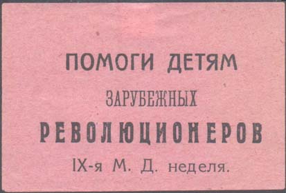 1929 г. Разм. 28 х 60 мм. Одноцветная печать на бумаге различного качества и цветов. В центре текст в шесть строк: «На помощь детям политзаключенных». Сверху текст в две строки: «9-ая М.Д.Н.».