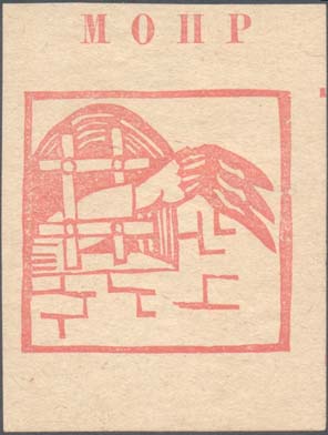 1924 г. 24.08.1924 г. Разм. 48 х 57 мм. Двухцветная печать на кремовой бумаге. В центре в прямоугольной рамке разм. 32,5 х 34,5 мм эмблема МОПР. Сверху аббревиатура «МОПР». Внизу текст в две строки: «Международная организация помощи борцам революции». Внизу номинал.