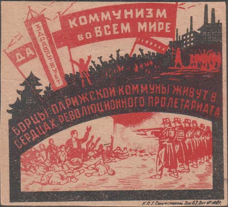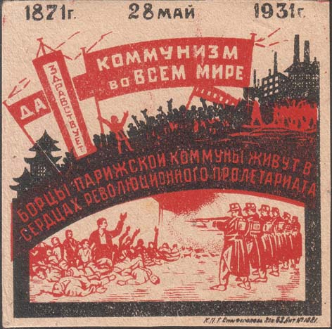 1931 г. 28.05.1931 г. Разм. 82 х 80 мм. Разм. рисунка 76 х 76 мм. Двухцветная печать на сероватой бумаге низкого качества. Сверху демонстрация рабочих на фоне городских пейзажей. На транспарантах текст на двух языках: «Да здравствует коммунизм во всем мире». Внизу сцена расстрела героев Парижской коммуны. В центре между рисунками текст на двух языках: «Борцы парижской коммуны живут в сердцах революционного пролетариата». Внизу справа под рамкой мелким шрифтом выходные данные: «К.П.Т. Симф. Лит. №502».