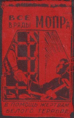 1931 г. 01.09.1931 г. Разм. 40 х 62 мм. Одноцветная печать на материи красного цвета (оттенки). В центре эмблема МОПР. Верху текст в две строки: «Все в ряды МОПРа». Внизу текст в две строки: «В помощь жертвам белого террора».