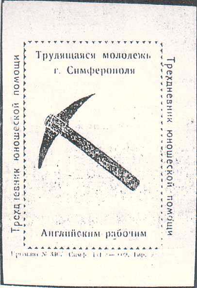 1926(?) г. Разм. 66 x 89 мм. Одноцветная печать на белой бумаге. В прямоугольной пунктирной рамке разм. 50 x 72,5 мм в центре кирка. Сверху текст в две строки: «Трудящаяся молодежь г. Симферополя!». Внизу продолжение текста: «Английским рабочим». По бокам снаружи рамки вертикально текст: «Трехдневник юношеской помощи». Внизу под рамкой выходные данные мелким шрифтом: «Крымлит. №3367. Симф. 1-609. Тир.5000».