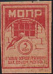 1931 г. Разм. рамки 27 х 36 мм. Одноцветная печать на желто-серой бумаге. В тройной прямоугольной рамке в центре стилизованная эмблема МОПР. Ниже в двойной круглой рамке номинал. Сверху аббревиатура «МОПР». Внизу текст в две строки: «В пользу борцов революции Абх[азский]. Обком Мопра».