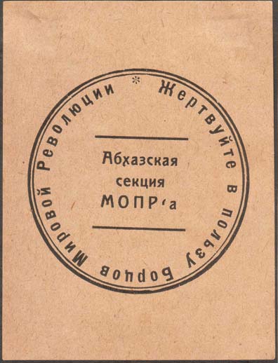 1931(?) г. Разм. 66 х 86 мм. Одноцветная печать на плотной бумаге различных цветов. В центре в двойной круглой рамке диаметром 53 мм между двух горизонтальных линий текст в три строки: «Абхазская секция МОПРа». По внутреннему периметру круглой рамки текст: «Жертвуйте в пользу Борцов Мировой Революции» и декоративный элемент.