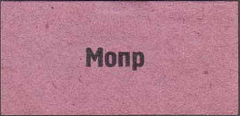 1930(?) г. Разм. 58 х 28 мм. Одноцветная печать на серо-фиолетовой бумаге. В центре аббревиатура «МОПР».