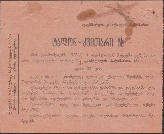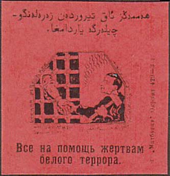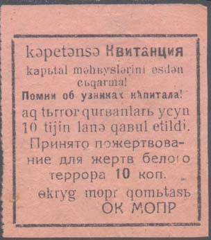 1931 г. Август. Листок из квитанционной книжки разм. 50 х 57 мм. Одноцветная печать на тонкой розово-серой бумаге. Левосторонняя нерегулярная зубц. В центре в прямоугольной рамке разм. 46 х 47 мм текст на русском и узбекском (латинской шрифтом) языках: «Квитанция. Помни об узниках капитала! Принято пожертвование для жертв белого террора 10 коп. ОК МОПР».