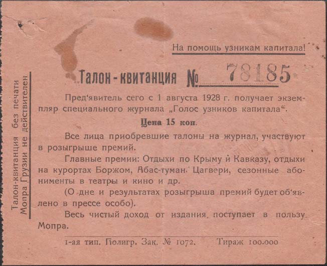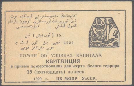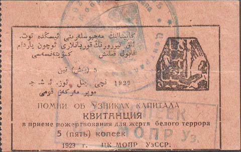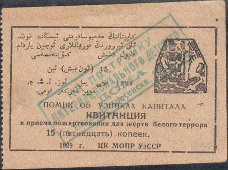 1929 г. Листок из квитанционной книжки разм. 78 х 50 мм. Одноцветная печать на бумаге различных цветов. Левосторонняя нерегулярная зубц. В прямоугольной рамке разм. 71 х 42 мм в центре текст в пять строк: «Помни об узниках капитала. Квитанция в приеме пожертвования для жертв белого террора ...(номинал цифрами и прописью) копеек 1929 г. ЦК МОПР УзССР». Левом верхнем углу текст в шесть строк на узбекском языке арабским шрифтом. В правом верхнем углу эмблема МОПР.