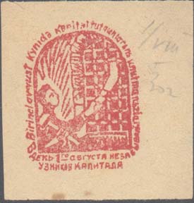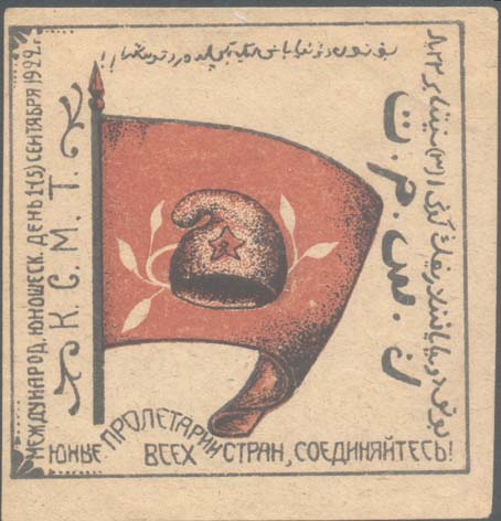 1922 г. 01.-05.09.1922 г. Разм. 76 х 78 мм. Двухцветная печать на желтоватой бумаге. В центре в прямоугольной рамке разм. 70 х 69 мм красный флаг с фригийским колпаком в центре. Слева вертикально текст в две строки: «Международ[ный]. Юношеск[ий]. День 1- (5) сентября 1922 г. К.С.М.Т.». Внизу текст: «Юные пролетарии всех стран, соединяйтесь!». Справа и сверху текст на узбекском языке арабским шрифтом.