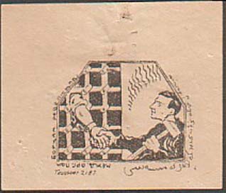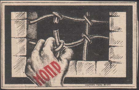 1931 г. 17.03.1931 г. Разм. 42 х 56 мм. Одноцветная печать на бумаге различных цветов. В прямоугольной рамке разм. 39 х 51 мм изображение руки узника в кандалах и с платком в окне с решет-кой. Сверху текст: «В пользу». Внизу продолжение текста: «МОПРА».