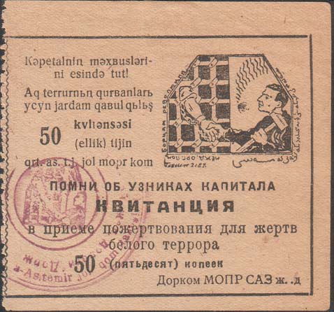 1932 г. Листок из квитанционной книжки разм. 80 х 75 мм. Одноцветная печать на желтоватой бумаге. Левосторонняя нерегулярная зубц. В прямоугольной рамке разм. 74 х 62 мм в центре текст в шесть строк: «Помни об узниках капитала. Квитанция в приеме пожертвования для жертв белого террора ... копеек. Дорком МОПР САЗ. ж.д.». В правом верхнем углу эмблема МОПР. Слева текст на узбекском языке латинским шрифтом в семь строк. На лицевой стороне оттиски круглой контрольной печати чернилами различных цветов.