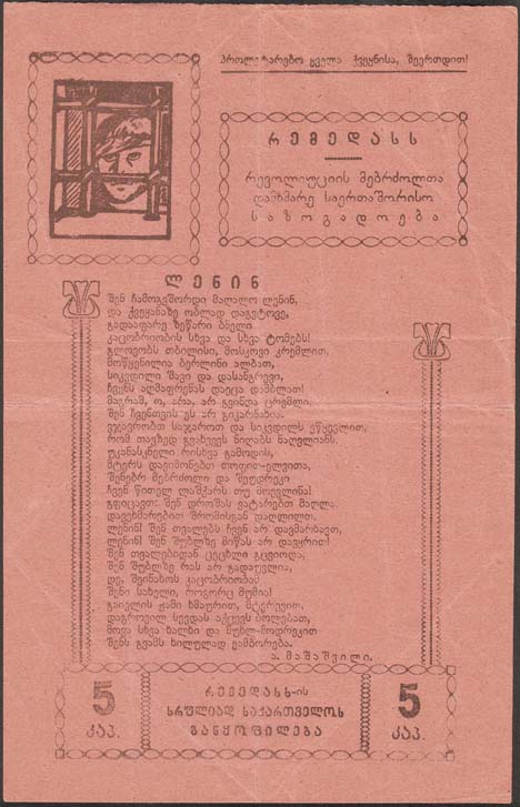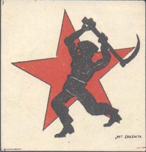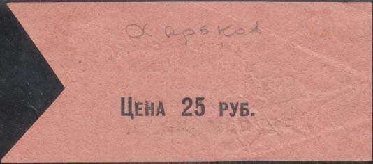 1923 г. Виньетка в форме флажка. Одноцветная двух-сторонняя печать на желтоватой бумаге. На лицевой стороне текст в пять строк: «Победоносный Союз Рабочих и Крестьян СССР борцам международной революции». На обороте текст: «Цена ... руб.».