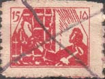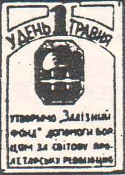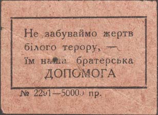 1930(?) г. Разм. 52 х 37 мм. Одноцветная печать на желтовато-серой бумаге низкого качества. В прямоугольной рамке разм. 45 х 24 мм текст в четыре строки на украинском языке: «Не забудем жертв белого террора, - им наша братская помощь». Внизу под рамкой мелким шрифтом выходные данные на украинском языке: «№2291 – 5000 шт.».