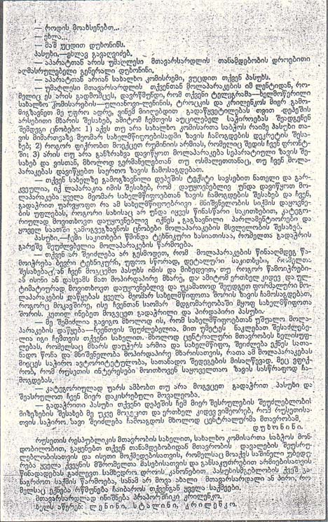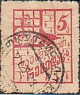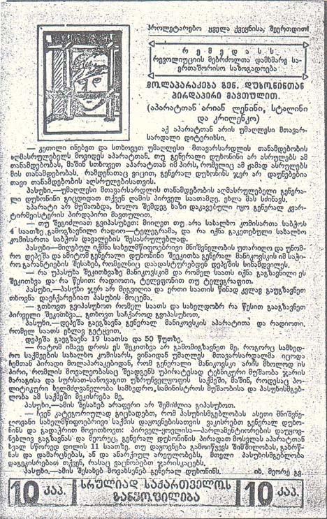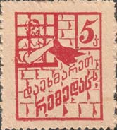 1930(?) г. Разм. 44 х 45 мм. Одноцветная печать на бумаге различных цветов. В центре в круглой рамке диаметром 32 мм эмблема МОПР. Сверху с внутренней стороны рамки полукругом текст в две строки на грузинском языке. Внизу с внутренней стороны рамки полукругом текст в две строки: «Жертвуйте узникам капитала».