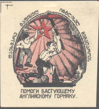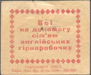 1926 г. 03.09.1926 г. Разм. 54 х 47 мм. Одноцветная печать на светло-бежевой бумаге. В прямоугольной рамке из ромбиков разм. 32 х 41 мм текст в пять строк на украинском языке: «Все на помощь семьям английских горнорабочих». Внизу под рамкой выходные данные мелким шрифтом в две строки: «Укрглавлит 3800/6. Харк. Шк. Печ. Дела 2096-200.000».