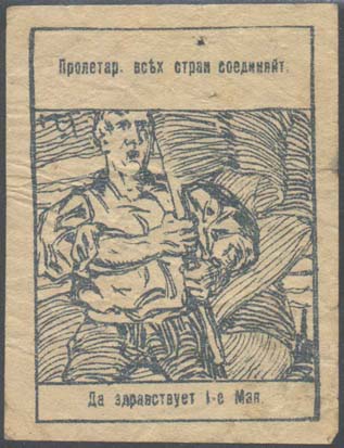 1924(?) г. Разм. рамки 44 х 61 мм. Одноцветная печать на тонкой серой бумаге. В прямоугольной рамке в центре рабочий со знаменем. На заднем плане завод. Сверху текст: «Пролетар[ии]. всех стран соединяйт[есь]». Внизу текст: «Да здравствует 1-е мая».