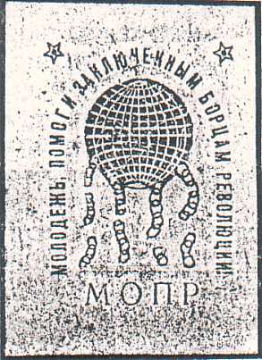 1928(?) г. Разм. 49 x 66 мм. Одноцветная печать на серовато-розовой бумаге. В центре аллегорический рисунок: символическое изображение земного шара с падающими цепями. По периметру текст: «Молодежь, помоги заключенным борцам революции! МОПР». В верхних углах декоративные элементы в виде пятиконечных звезд.