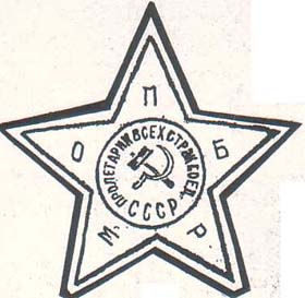 1923 г. Виньетка в форме пятиконечной звезды разм. 48 x 44 мм. Одноцветная печать на желтоватой бумаге. В рамке в форме пятиконечной звезды в центре в круглой рамке серп и молот. По внутреннему периметру круглой рамки текст: «СССР. Пролетарии всех стран, соед[иняйтесь].». В лучах звезды буквы аббревиатуры «М.0.П.Б.Р.