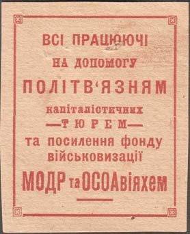 1930(?) г. Разм. 46 х 57 мм. Одноцветная печать на тол-стой желтоватой бумаге. В прямоугольной рамке разм. 40 х 49 мм с декоративными элементами по углам в центре текст в восемь строк на украинском языке: «Все трудящиеся на помощь политзаключенным капиталистических тюрем и усиление фонда военизации. МОПР и ОСО-АВИАХИМ».