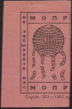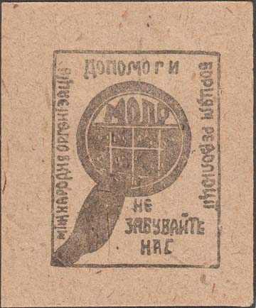 1930(?) г. Разм. 60 х 72 мм. Одноцветная печать на желтовато-серой бумаге низкого качества. В прямоугольной рамке разм. 40 х 50 мм в центре стилизованная эмблема МОПР в круглой рамке. По внутреннему периметру рамки текст на украинском языке: «Международная организация помощи борцам революции». В правом нижнем углу текст в три строки: «Не забывайте нас».