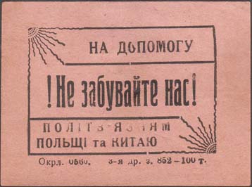 1930(?) г. Разм. 60 х 45 мм. Одноцветная печать на розово-серой бумаге. В прямоугольной декоративной рамке разм. 55 х 30 мм в центре текст на украинском языке: «!Не забывайте нас!». Сверху текст на украинском языке: «На помощь». Внизу продолжение текста в две строки на украинском языке: «Политзаключенным Польши и Китая». Внизу под рамкой мелким шрифтом выходные данные: «Окрл. 0560. 3-я тип. 3. 852- 100 т.».