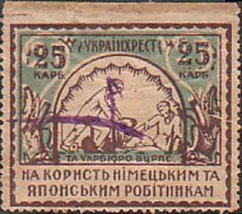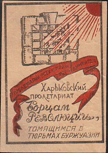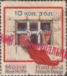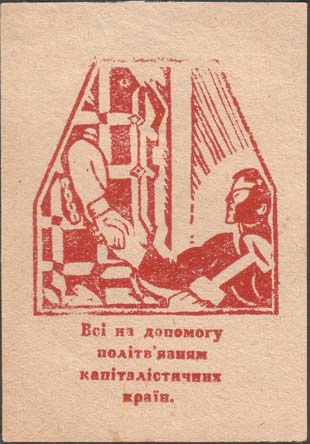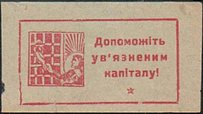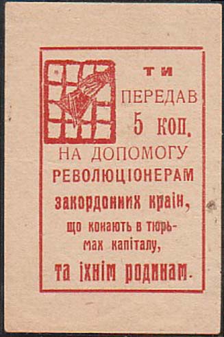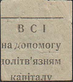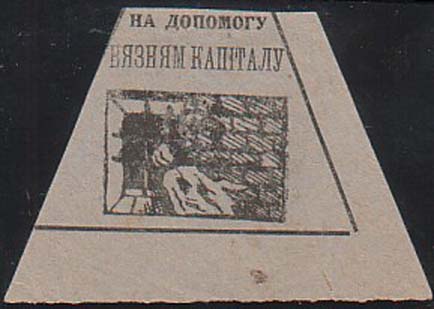 1930(?) г. Трапеция разм. 72 х 50 мм. Одноцветная печать на тонкой светло-серой бумаге. В рамке в форме трапеции окно с решеткой и рука узника с платком. Сверху текст в две строки на украинском языке: «На помощь узникам капитала».