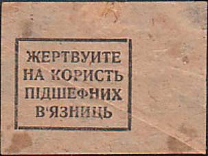 1930(?) г. Разм. 51 х 37 мм. Одноцветная печать тонкой сероватой бумаге низкого качества. В центре в прямоугольной рамке разм. 29 х 22 мм текст на украинском языке: «Жертвуйте в помощь подшефных тюрем».