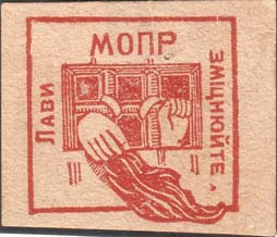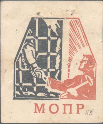 1930(?) г. Разм. 55 х 66 мм. Двухцветная печать на бумаге различных цветов. В центре эмблема МОПР. Внизу аббревиатура «МОПР».