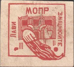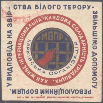 1930(?) г. Разм. 52 х 74 мм. Одноцветная печать на желтоватой бумаге. В центре эмблема МОПР. Внизу текст в четыре строки на украинском языке: «Все на помощь политзаключенным капиталистических стран».