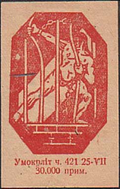 1930(?) г. Разм. 40 х 63 мм. Одноцветная печать на желтоватой бумаге. В центре в восьмиугольной рамке аллегорический рисунок: заключенный разгибает прутья тюремной решетки. Внизу выходные данные мелким шрифтом на украинском языке.