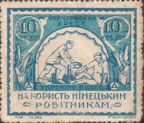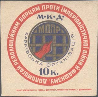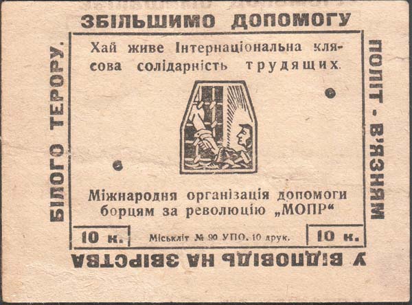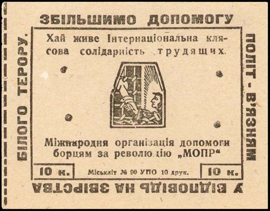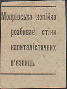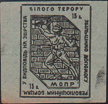 1930(?) г. Разм. 63 х 60 мм. Одноцветная печать на серо-синеватой бумаге низкого качества. В центре в прямоугольной рамке разм. 42 х 55 мм аллегорический рисунок: узник, тянущийся к окну с решеткой. Внизу аббревиатура «МОПР». В правом верхнем и левом нижнем углах номинал. По внутреннему периметру рамки текст на украинском языке: «В ответ на зверства белого террора усилим помощь революционным борцам».