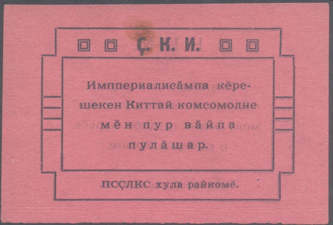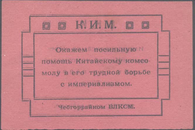 1926(?) г. Листок разм 110 х 74 мм. Одноцветная двухсторонняя печать на плотной розовой бумаге. На лицевой стороне в двойной прямоугольной декоративной рамке разм. 85 х 58 мм текст в четыре строки: «Окажем посильную помощь китайскому Комсомолу в его трудной борьбе с империализмом». Сверху между рамками аббревиатура «К.И.М.». Внизу между рамками текст: «Чебгоррайком ВЛКСМ». На оборотной стороне в такой же рамке тот же текст на чувашском языке.