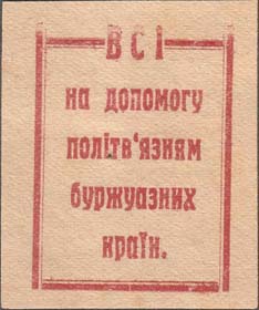 1929 г. 18.03.29 г. Разм. 40 х 47 мм. Одноцветная печать на желтоватой бумаге. В прямоугольной рамке разм. 30 х 38 мм текст в пять строк на украинском языке: «Все на помощь политзаключенным буржуазных стран».