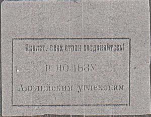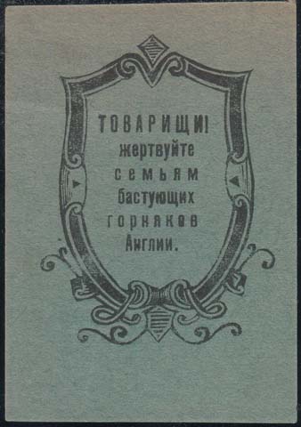 1926 г. Разм. рамки 46 х 26 мм. Одноцветная печать на красно-фиолетовой бумаге. В прямоугольной рамке в центре текст в две строки: «В пользу английским углекопам». Сверху текст: «Пролет[арии]. всех стран соединяйтесь!».