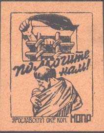 1926(?) г. Разм. 35 х 45 мм. Одноцветная печать на бумаге различных цветов. В центре в прямо-угольной рамке разм. 28 х 36 мм сверху эмблема МОПР. Внизу фигура мужчины. В центре текст в две строки: «Помогите нам!». Внизу под рамкой текс: «Ярославский Окр[ужной]. Ком[итет]. МОПР».