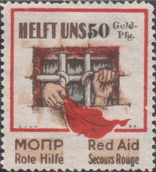1928 г. Май. Разм. 40 х 45 мм. Одноцветная печать на серо-зеленой бумаге. В центре текст в четыре строки: «Все на помощь политзаключенным капитала». Сверху и снизу горизонтальные линии.