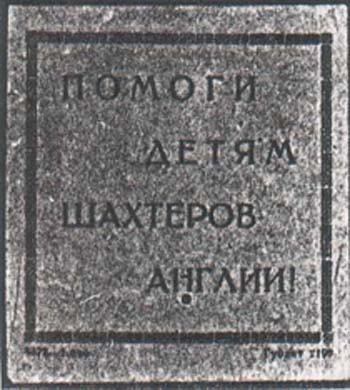 1926 г. Разм. рамки 58 х 58 мм. Одноцветная печать на оранжевой бумаге. В прямоугольной рамке текст в четыре строки: «Помоги детям шахтеров Англии!». Внизу под рамкой мелким шрифтом выходные данные: «»5473 1000. Гублит 2199.
