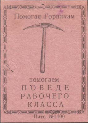 1926 г. Разм. 48 х 66 мм. Одноцветная печать на розовой бумаге. В прямоугольной декоративной рамке разм. 44 х 58 мм. В центре кирка. Сверху текст: «Помогая Горнякам». Внизу продолжение текста в четыре строки: «Помогаем победе рабочего класса». Внизу под рамкой мелким шрифтом выходные данные: «Лито №1400».