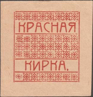 1926 г. Разм. 52 х 55 мм. Одноцветная печать на желто-серой бумаге. В прямоугольной рамке разм. 37 х 40 мм на фоне орнамента текст в две строки: «Красная кирка».