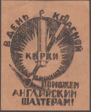 1926 г. Разм. 49 х 62 мм. Одноцветная печать на плот-ной желто-серой бумаге. В центре в круглой рамке шахтерская лампа и кирка. Текст в пять строк: «В день красной кирки поможем английским шахтерам!».