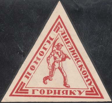 1926 г. Треугольник разм. рамки 65 х 64 мм. Одноцветная печать на плотной бумаге различных цветов. В двойной треугольной рамке в центре шахтер с киркой и лампой. По периметру между рамками текст: «Помоги английскому горняку».