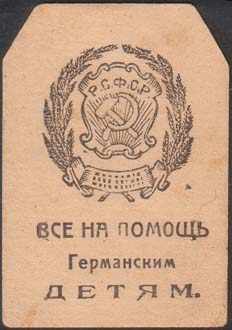 1926(?) г. Виньетка в форме прямоугольника разм. 38 х 54 мм со срезанными верхними углами. Одноцветная печать на плотной желтоватой бумаге. В центре герб РСФСР. Внизу текст в три строки: «Все на помощь Германским детям».