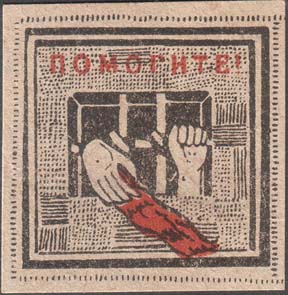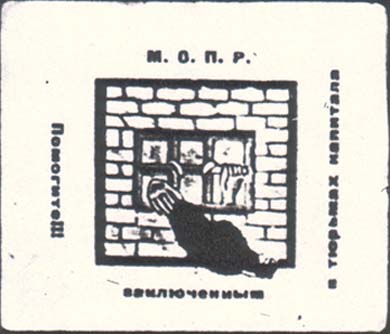 1930(?) г. Разм. 45 х 55 мм. Одноцветная печать на бумаге различных цветов. В прямоугольной рамке из растительного орнамента разм. 36 х 45 мм текст в четыре строки: «Через МОПР помоги узникам капитала».
