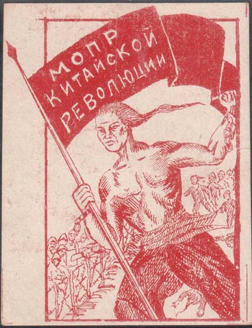 1926(?) г. Разм. 62 х 80 мм. Одноцветная печать на сероватой бумаге с мелованным верхним слоем. В прямоугольной рамке разм. 48 х 73 мм в центре китаец со знаменам во главе демонстрации. На полотнище знамени тест в три строки: «МОПР китайской революции».