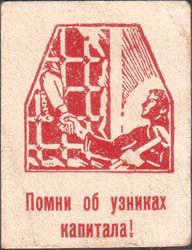 1927(?) г. Разм. 32 х 41 мм. Одноцветная печать на толстой белой бумаге. В центре эмблема МОПР. Внизу текст в две строки: «Помни об узниках капитала!».